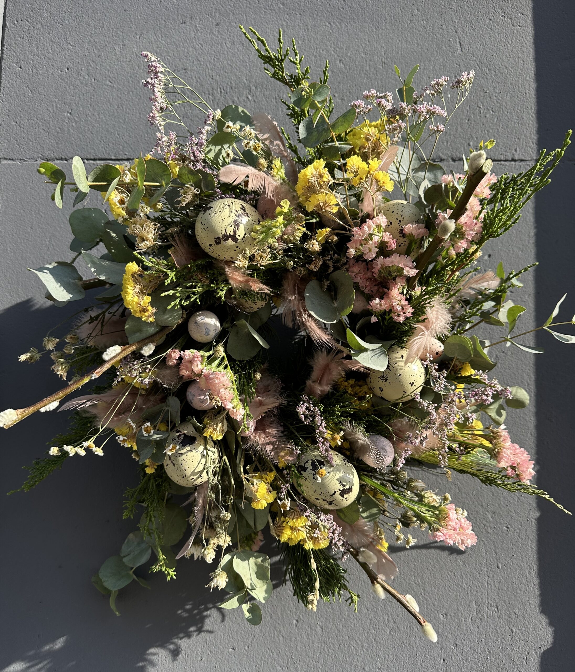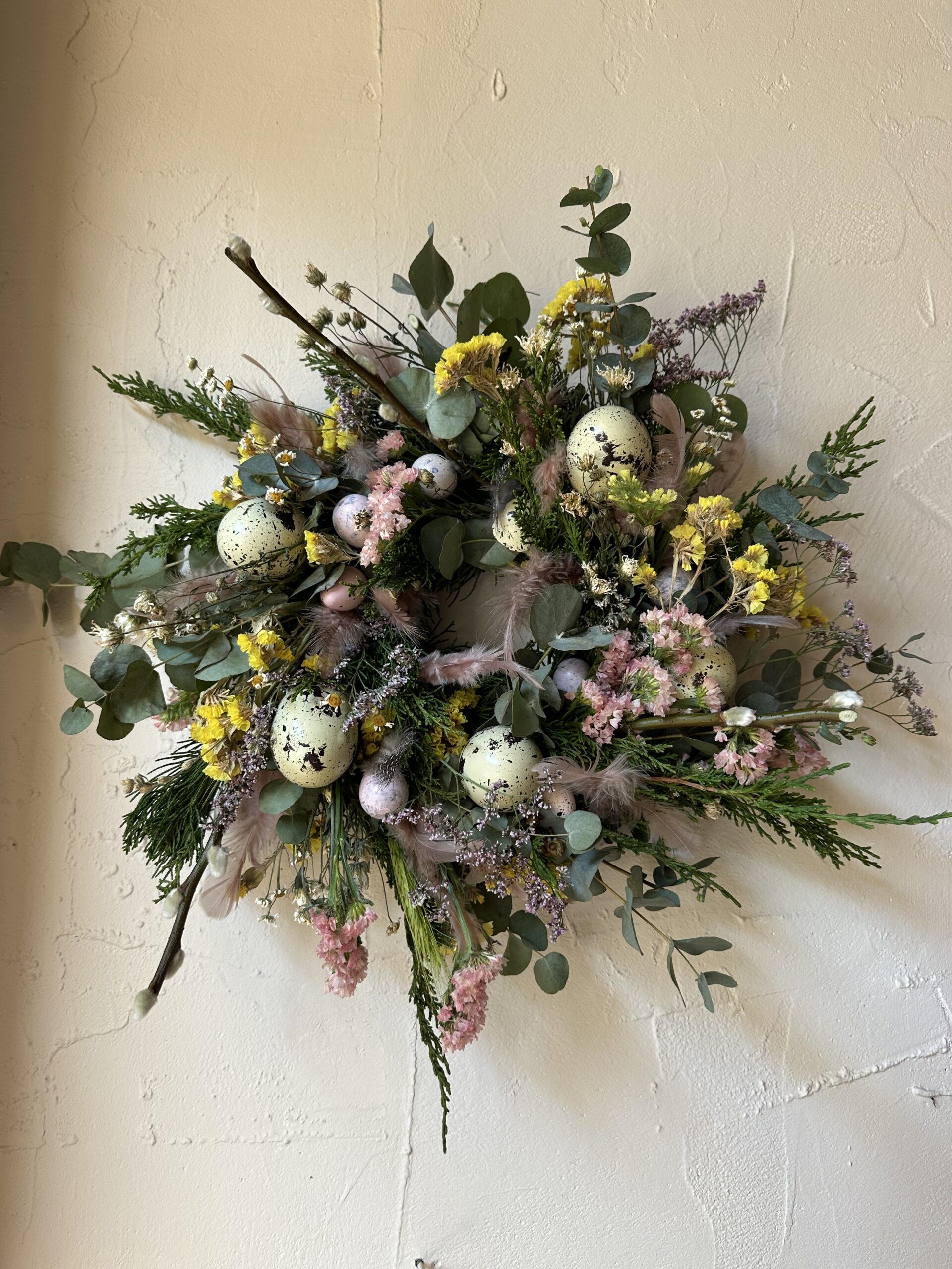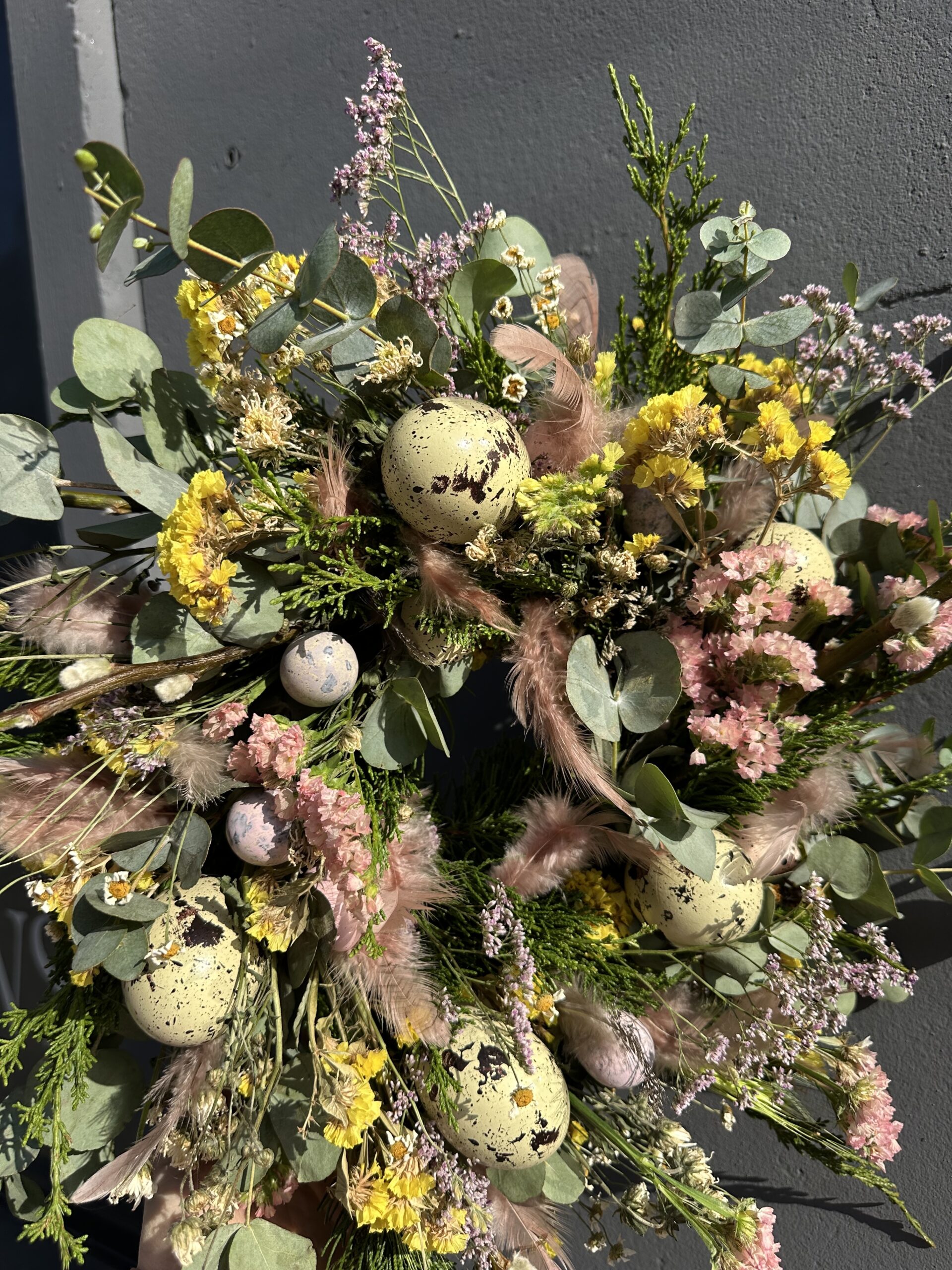 Veľkonočný veniec vyrobený z prírodných materiálo. Základ tvorí voňavá zeleň, ktorá je doplnená o sušené kvety z našj záhrady. Nesmú chýbať bahniatka a prepeličie či slepačie vajíčka.